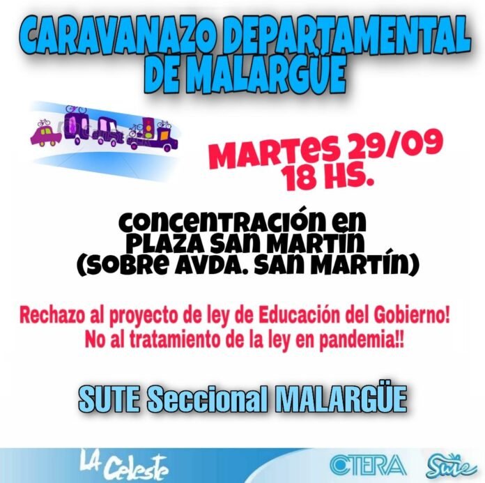 El SUTE (Sindicato unido de trabajadora de la educación) seccional Malargüe convocó a un caravanazo para el próximo martes 29, a las 18:00.