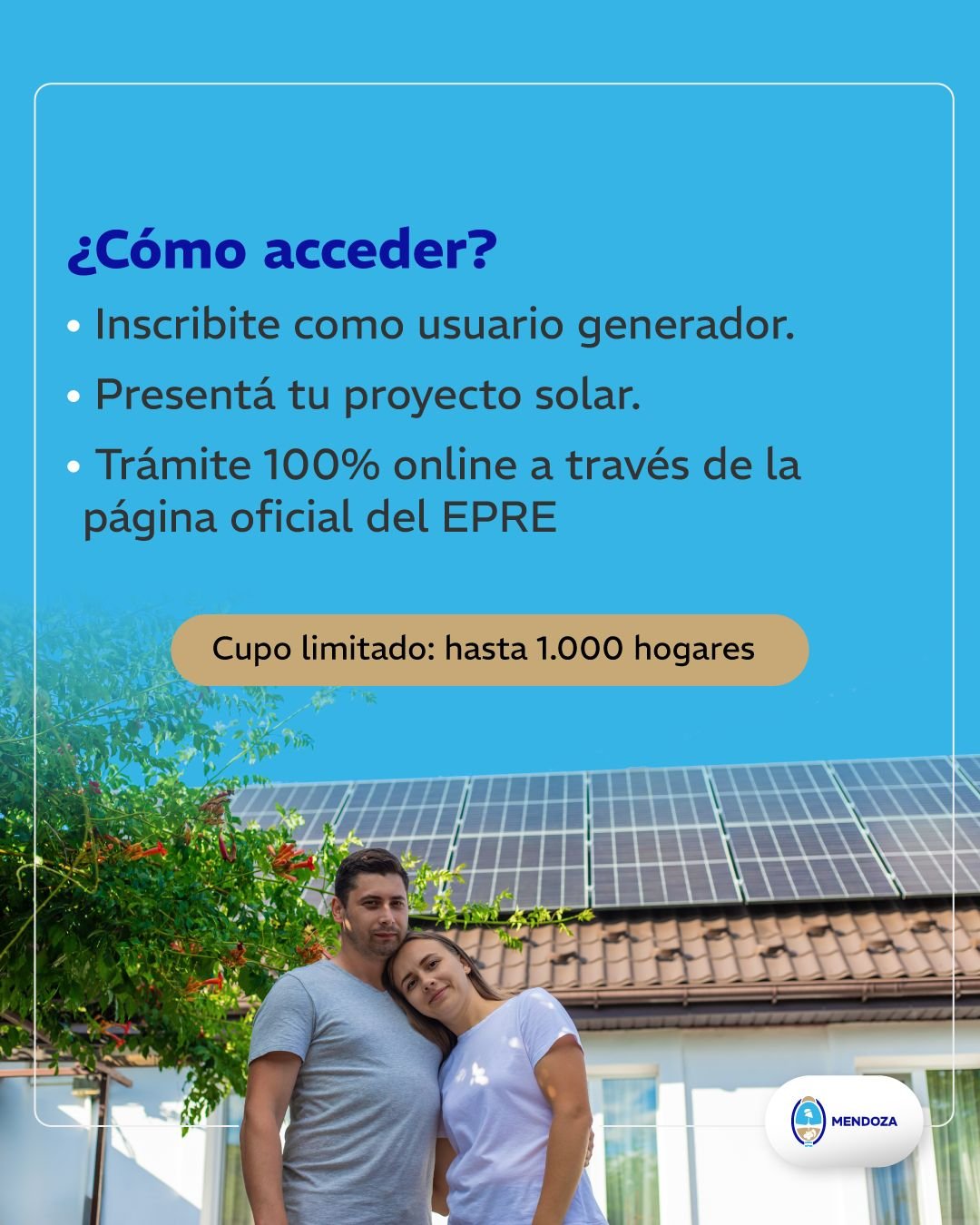 El Gobierno de Mendoza presentó el Programa de Incentivos a la Generación Distribuida Residencial, con financiamiento de hasta el 40% para paneles solares. La iniciativa busca ampliar el uso de energías renovables y reducir el costo eléctrico en los hogares.