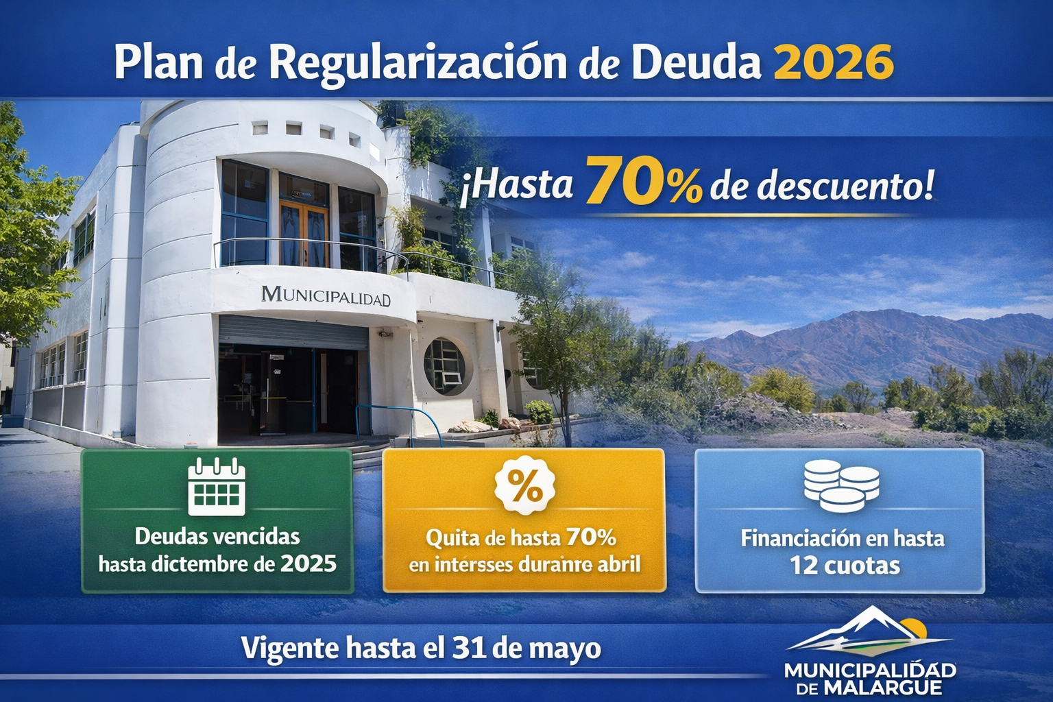 La Municipalidad de Malargüe presentó el Plan de Regularización de Deuda 2026 con descuentos de hasta el 70% en intereses y financiación en cuotas. La medida alcanza obligaciones vencidas hasta diciembre de 2025 y estará vigente hasta el 31 de mayo.