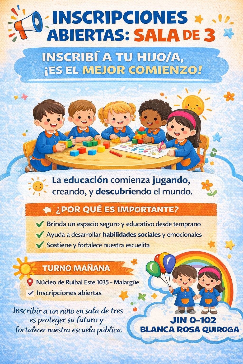 El JIN N° 0-102 Blanca Rosa Quiroga de Malargüe informó que están abiertas las inscripciones para sala de 3 en turno mañana. La convocatoria apunta a garantizar el acceso temprano a la educación inicial en la ciudad.