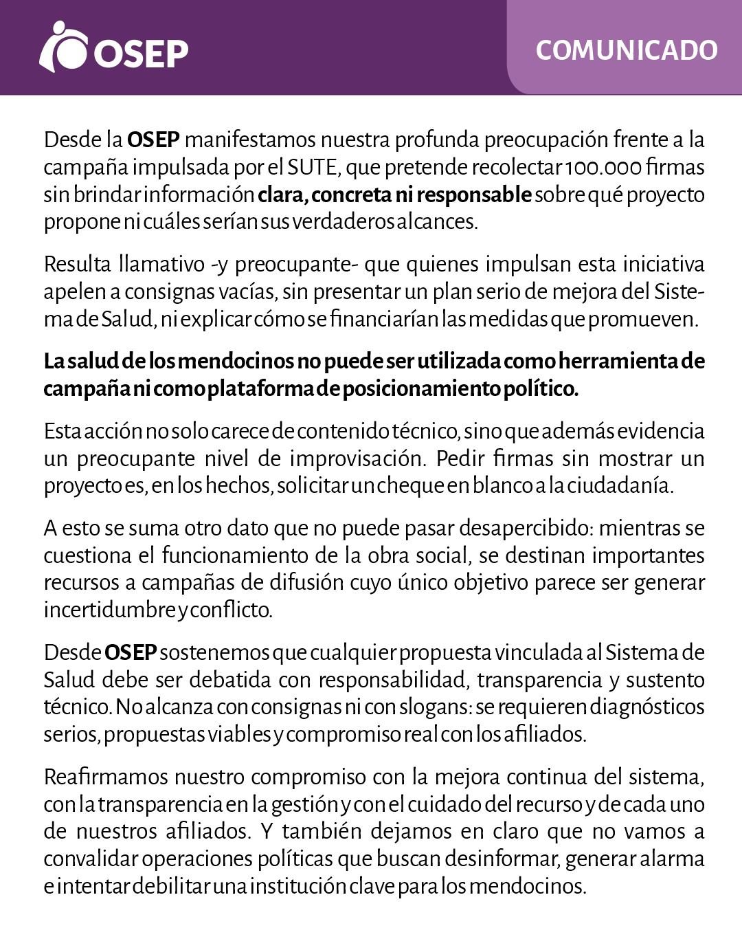 Tras la difusión pública de la campaña, OSEP emitió un comunicado en el que manifestó “profunda preocupación” por la junta de firmas impulsada por el SUTE, y cuestionó que se busque adhesión “sin brindar información clara, concreta ni responsable” sobre el proyecto y sus alcances. En ese texto, la obra social sostuvo que la propuesta apela a “consignas vacías” y que no se explicita un plan serio de mejora ni su financiamiento.