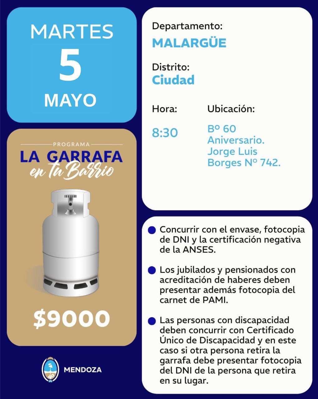 La senadora provincial Jésica Laferte anunció cambios en el programa La Garrafa en tu Barrio en Malargüe: se incorporan operativos los martes, nuevos puntos de distribución y un operativo mensual para zona rural. El próximo operativo será el martes 5 de mayo y la garrafa de 10 kg costará $9.000, con un aumento previsto para el operativo siguiente.