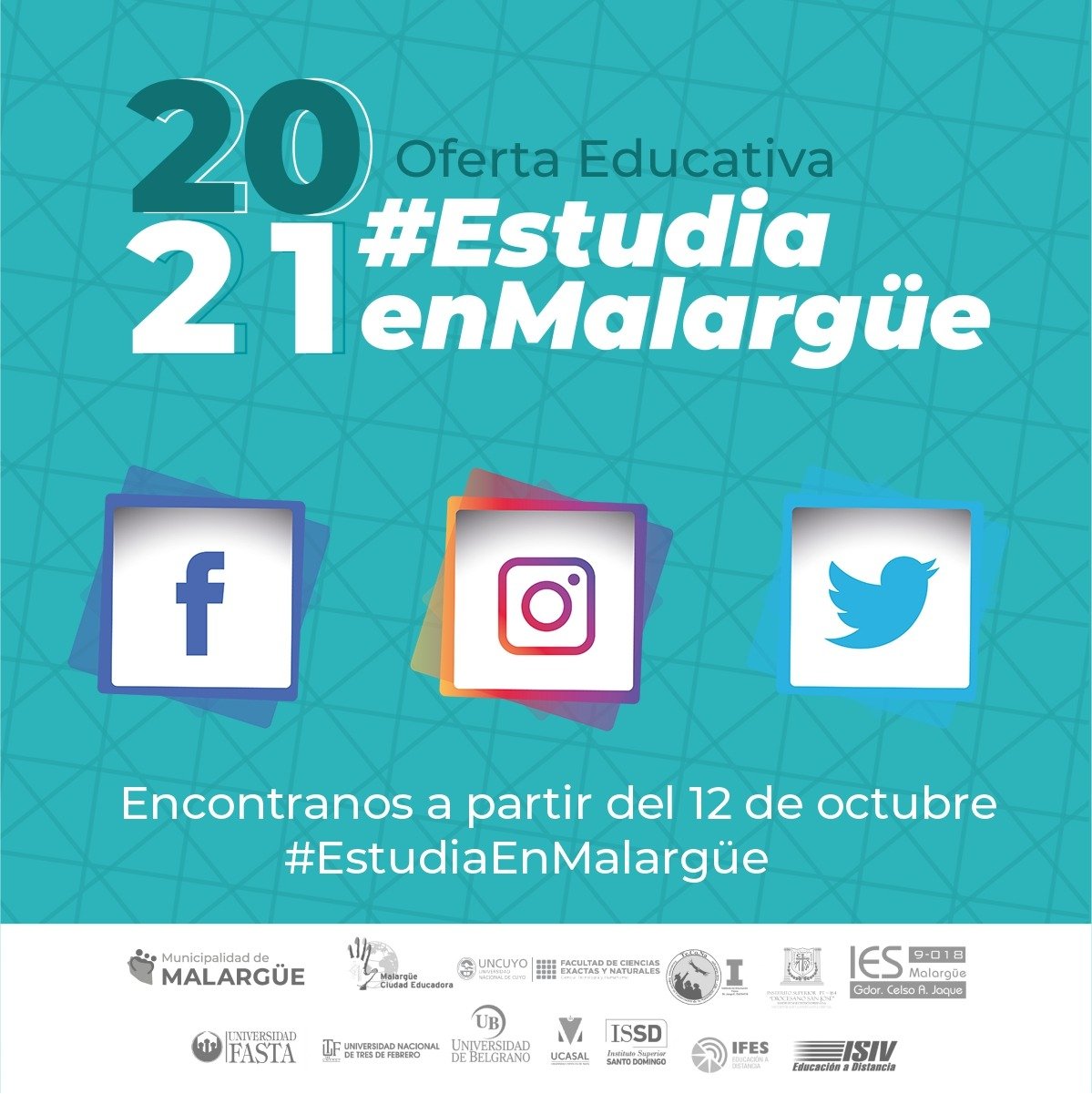 “Estudiá en Malargüe” se denominarán todas las páginas de las redes sociales donde estará disponible la oferta educativa, las que oficialmente se abrirán mañana, 12 de octubre, a las 08:00 y estarán abiertas por lo que resta de 2020 y los primeros meses de 2021.