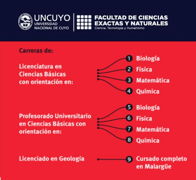 La Facultad ofrece la posibilidad de estudiar licenciaturas y profesorados universitarios en Biología, Física, Geología, Matemática y Química y articular con carreras de Ingeniería de otras facultades de la Universidad Nacional de Cuyo.