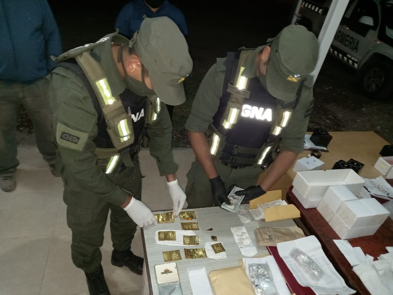 Durante la requisa, los gendarmes detectaron que transportaba además 5.000 dólares, 396.2 gramos de oro en láminas, 18 anillos de oro, 22 pares de aros enchapados, 13 relojes y 0,5 gramos de marihuana.