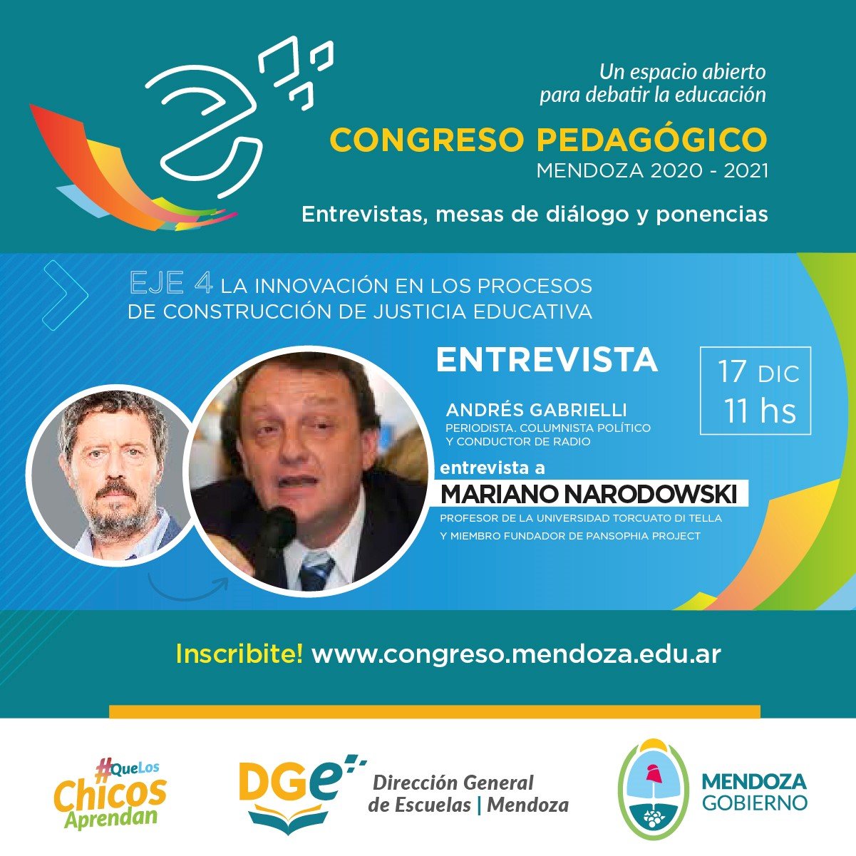 La Dirección General de Escuelas invita a toda la comunidad en su conjunto a participar de la cuarta instancia del Congreso Pedagógico Mendoza 2020-2021 donde se reflexionará y debatirá sobre el eje de innovación en los procesos de construcción de justicia educativa, que se desarrollará el próximo jueves 17 de diciembre a partir de las 11 horas.